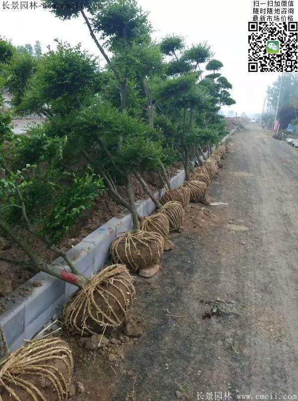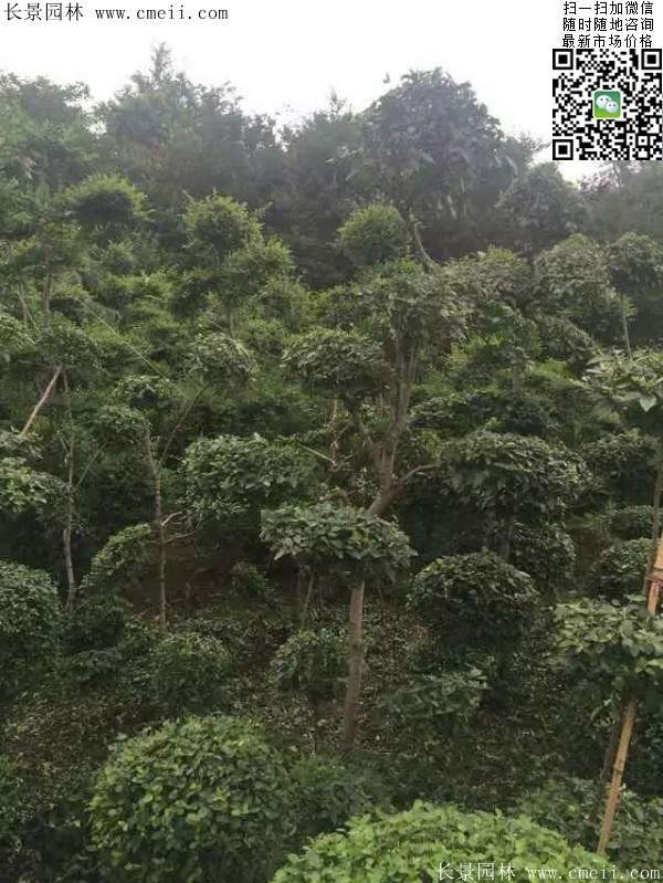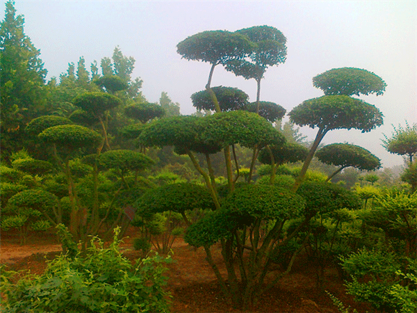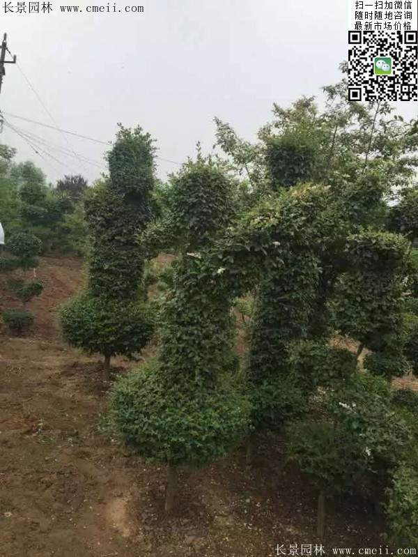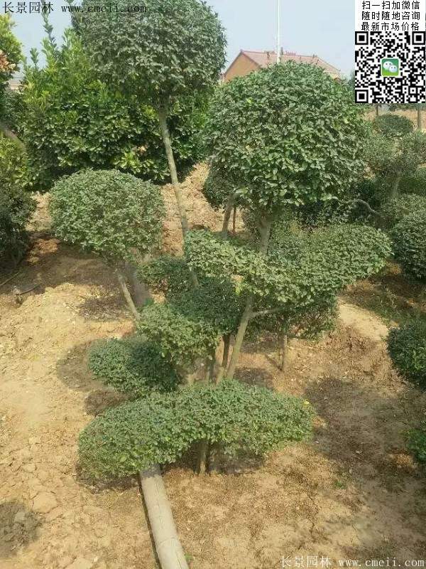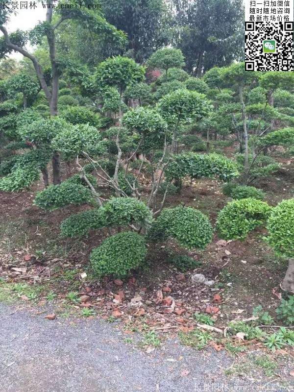 小葉女貞造型樹,經過人工整形及修剪成形,形態各異,多為多球形或云片型,高1.2米至3米,叢生或獨干,每株可存有幾個至十幾個球(或云片)。它葉小、常綠,且耐修剪,生長迅速,盆栽可制成大、中、小型盆景。極易成活,樹條柔嫩易扎定型,極富自然野趣。